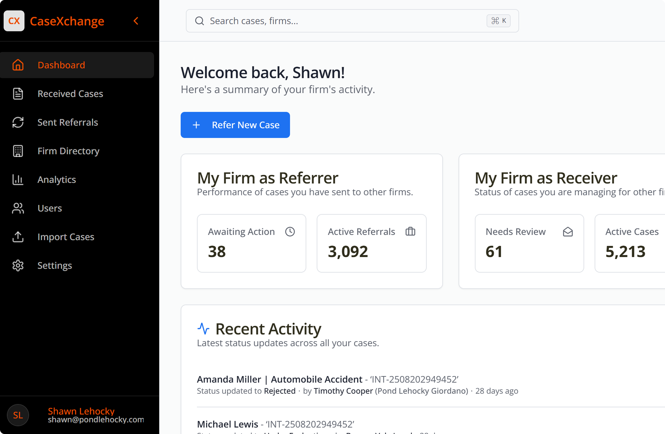 Case Xchange is the all-in-one referral platform built by lawyers, for lawyers. We know firsthand how frustrating it is to chase down updates, juggle spreadsheets, or lose out on referral fees due to miscommunication. Our platform transforms that chaos into clarity.