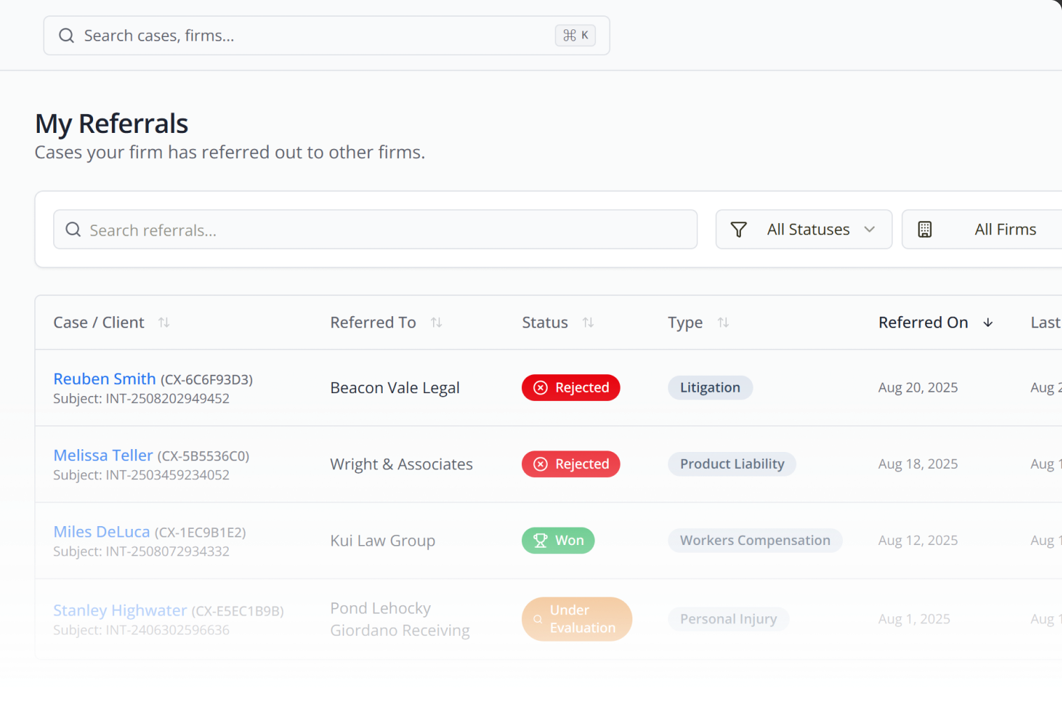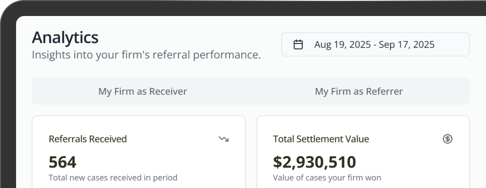 Grow smarter. Case Xchange gives you powerful analytics and referral management tools to optimize performance, track partner success rates, and accelerate the expansion of your co-counsel network. From live transfers to pre-retained cases, everything is organized in one source of truth.