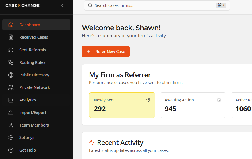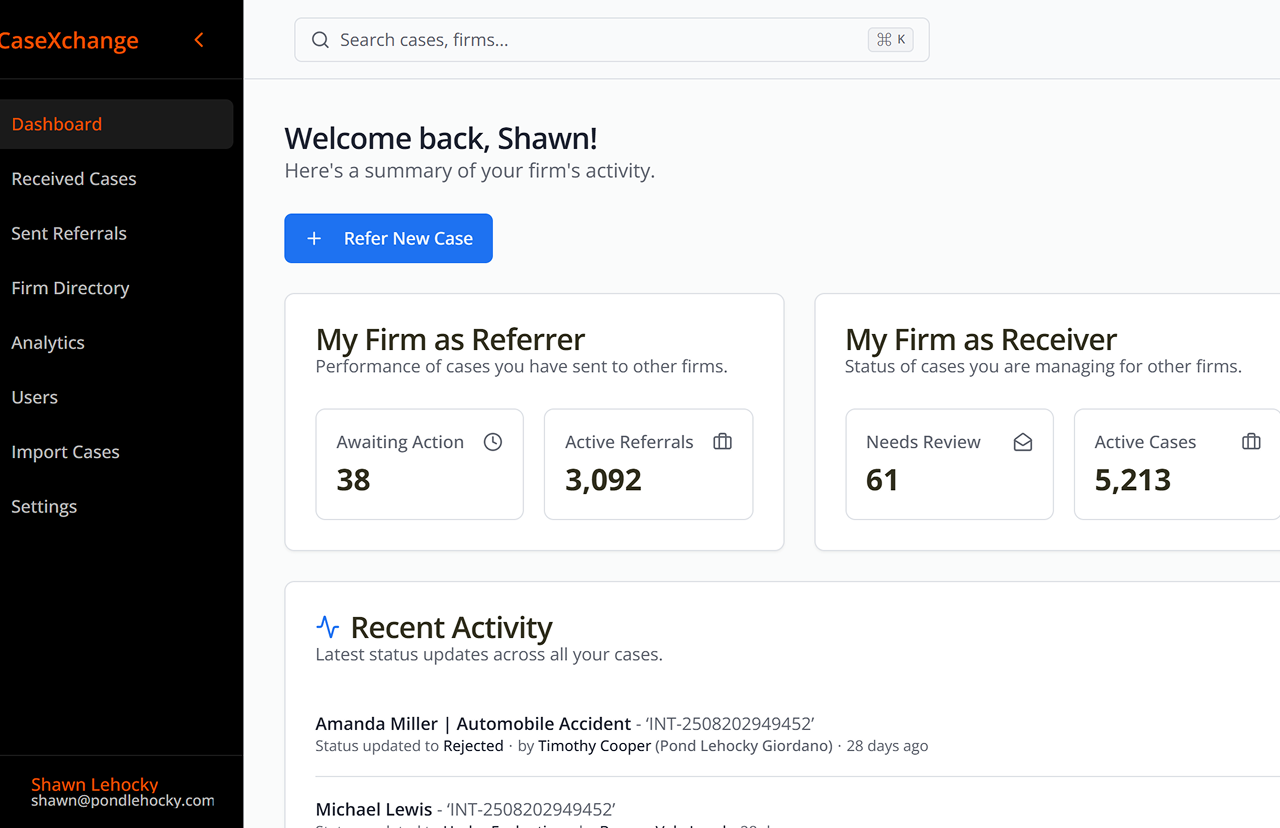 Case Xchange is the all-in-one referral platform built by lawyers, for lawyers. We know firsthand how frustrating it is to chase down updates, juggle spreadsheets, or lose out on referral fees due to miscommunication. Our platform transforms that chaos into clarity.